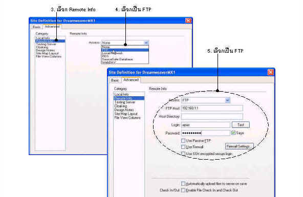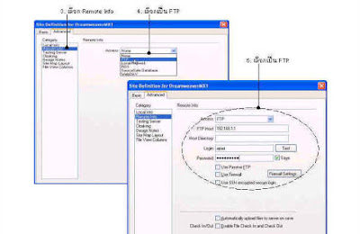 ที่หน้าต่าง Site ให้เรากำหนดข้อมูลเกี่ยวกับเว็บไซต์ของเราในหัวข้อ Local Info และข้อมูลเกี่ยวกับเครื่องเว็บเซิร์ฟเวอร์ที่เราจะทำการอัพโหลดไฟล์ในหัวข้อ Web Server Info