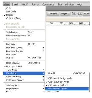 แสดงเส้นนี้โดย เลือกคา สั่ง view > visual aids > AP Element outlines และ CSS layout outlines
